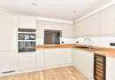 The contemporary fitted kitchen features sleek handleless cabinetry, integrated appliances, and a wine cooler, combining elegance with everyday practicality. An optional central kitchen island can be added.