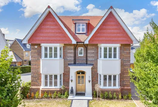 With its chimneystack, differing roof lines, leaded light windows and covered porch, the house has charming external appeal. While internally this light and airy house has panelled doors, coved ceilings and fireplace to enhance the delightful character. The kitchen/breakfast room, dining room and sitting room also have patio doors leading to the rear terrace, providing wonderful views across the garden and beyond as far as the London skyline.