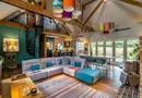 There is a front garden and a pathway to a terrace and the entrance which opens directly into the magnificent, double-height vaulted kitchen/dining and living space. This truly impressive room includes dramatic crossbeams, an elegant spiral staircase to the first-floor galleried landing, five bi-fold doors to the rear garden and oak flooring throughout. A striking chimney breast with a log-burner forms the natural focal point of the seating area while the kitchen/breakfast zone, laid with French terra-cotta floor tiles, offers shaker-style units with oak worktops, a range cooker, integrated appliances and a peninsular breakfast bar and the adjacent utility room includes a stable door to the rear terrace.