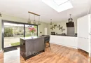 The dining room includes access to the utility room and cloakroom and double doors to the stunning kitchen/breakfast room. This has a large lantern skylight, a larder and units housing a variety of built in appliances and a trendy central island/breakfast bar.