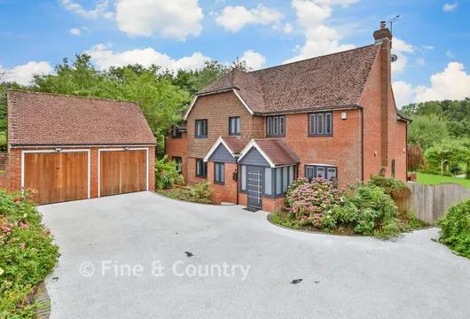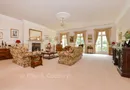 The gardens feature an upper patio surrounded by colourful plantings and a lower balustraded terrace overlooking the koi carp pond with its rockery and waterfall. There is a greenhouse, a garden shed and a workshop at the rear of the double garage as well as lawns, shrub borders, trees and a gate to the woodland. The front garden includes a lawn, a patio with raised rose beds and hedging, and opens into a vast garden area surrounded by hedging and trees.
