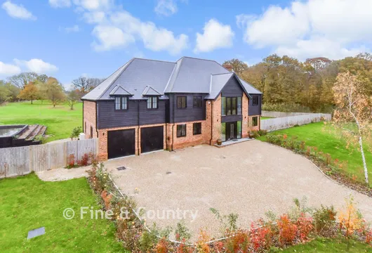 The kitchen/breakfast room has tiled flooring, a range cooker and wood units with granite worktops housing appliances and an ornamental stove plus space for a table and chairs. Double doors open into the dual aspect family room that includes full height and bay windows. The superb dual aspect dining room has French doors onto the driveway and double doors to the elegant sitting room that features an impressive marble fireplace with a log burner and French doors to the veranda. There is a fitted utility room with access to the garden and a larder cupboard under the staircase. This leads to a half landing with an arched stained glass window and to the galleried landing. There is a contemporary family shower room and five double bedrooms with bespoke shutters and lovely views. These include a dual aspect with fitted wardrobes and an ensuite guest room with built in cupboards plus the impressive principal suite with built in wardrobes and a luxurious en-suite bath/shower room.